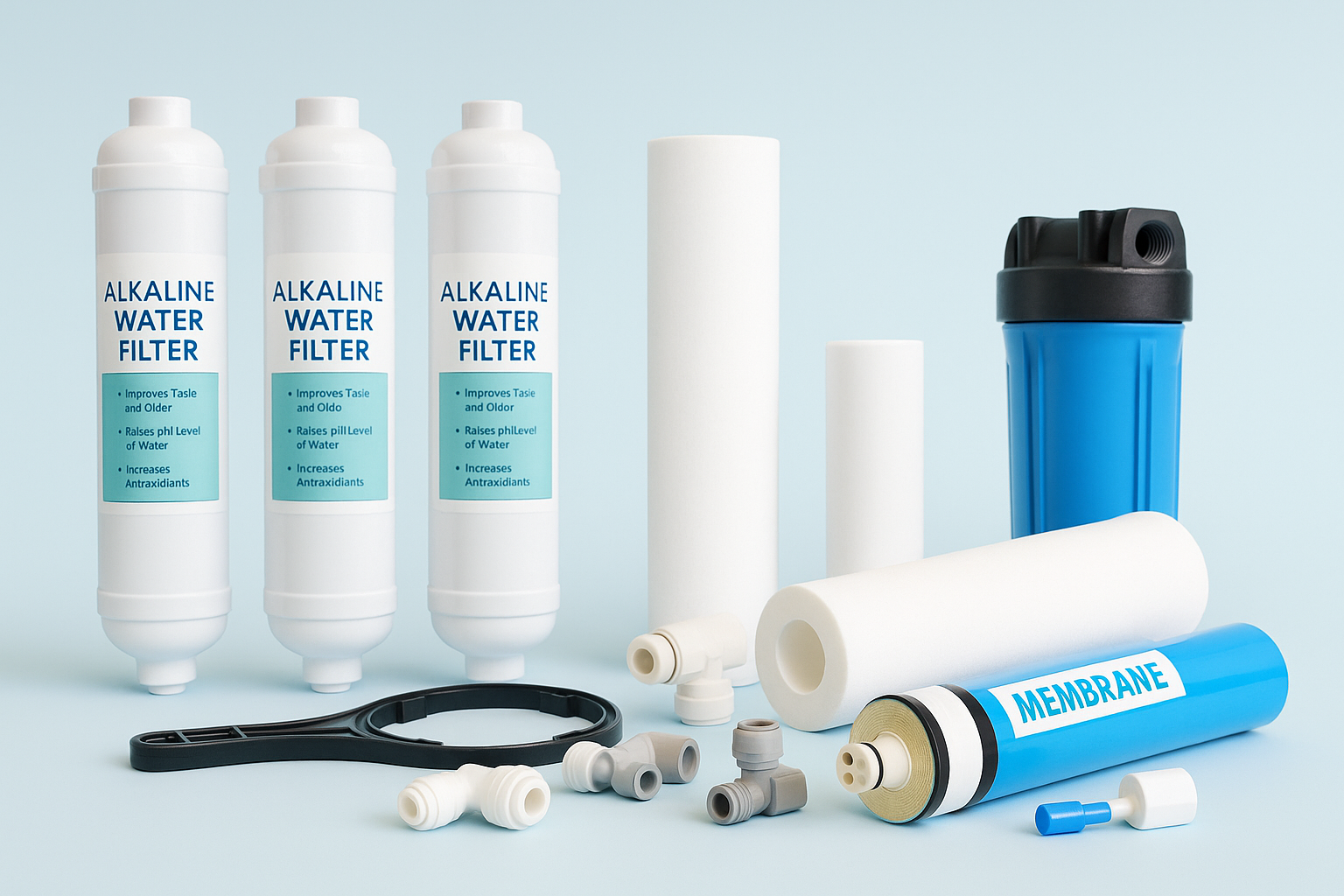 Alkaline filters, membranes, and spare parts to maintain pH balance, improve taste, and ensure long-lasting system performance.